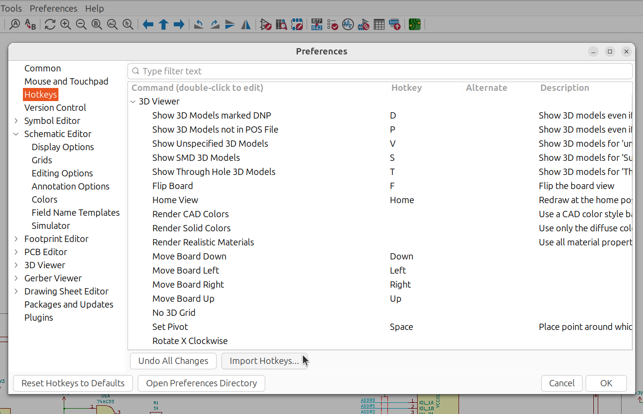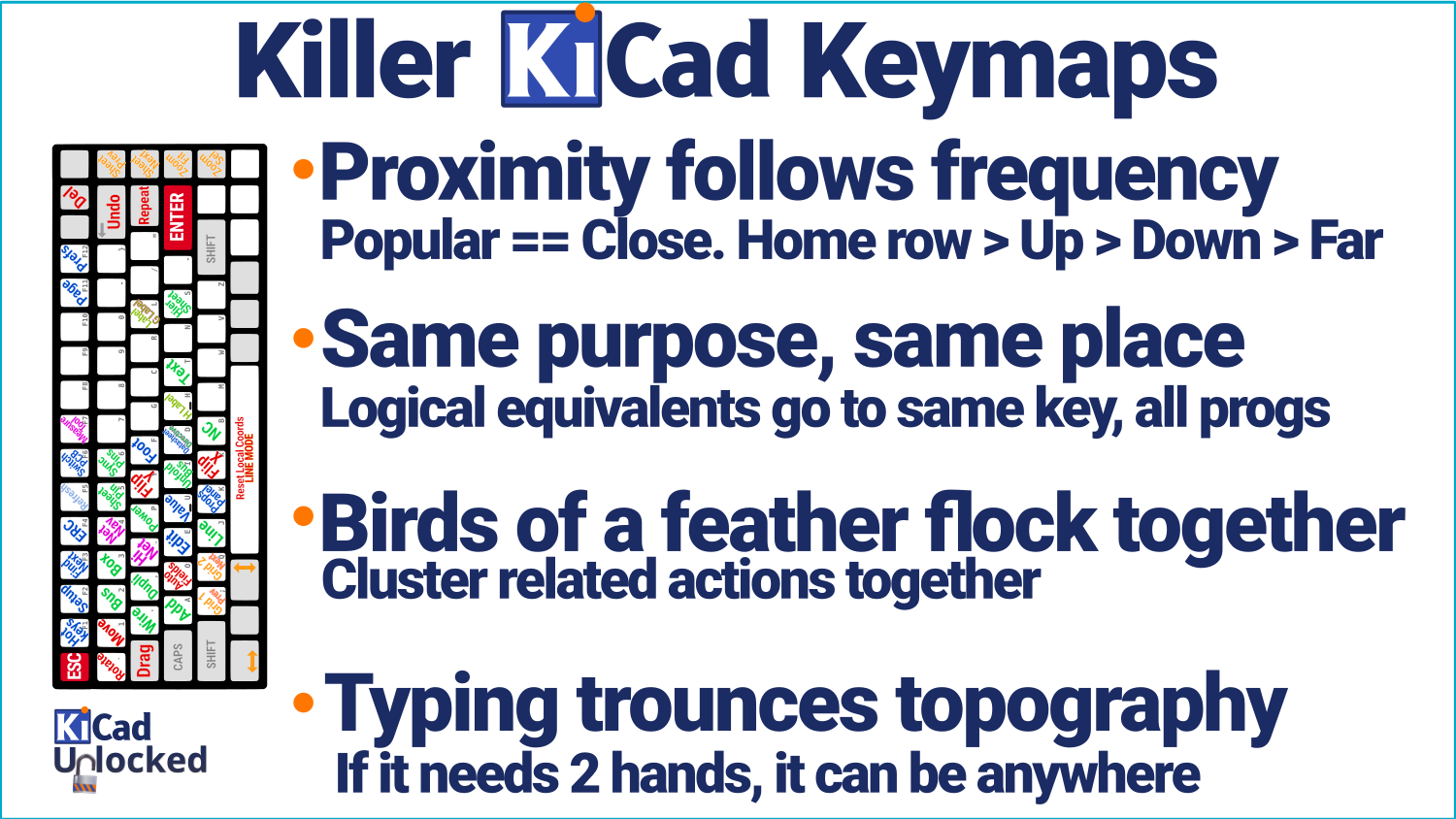 You can download my KiCad keyboard shortcut maps, below, along with easy-to-customize cheatsheets to help with learning. If you want to roll your own, here is my recipe for creating the mappings: